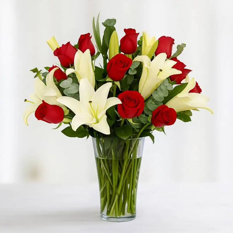 La mezcla de rosas y lirios es perfecta para expresar afecto y buenas intenciones a una persona, este diseño floral contiene 12 rosas rojas, 4 varas de lirios blancos y follajes verdes sobre un jarrón de vidrio. Te recomendamos acompañar este diseño con globos, chocolates, peluches o vinos para hacer aún más especial tu detalle, en el siguiente paso de la compra puedes agregar a tu orden estos productos si lo deseas.