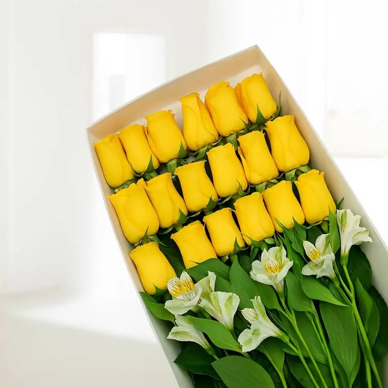 Una delicada caja esconde los más intensos sentimientos del alma, sentirá como la pasión se apodera de su vida, sorprende a ese ser con este hermoso detalle. Adentro de la caja se ubican 18 rosas amarillas y follajes verdes, la caja va con su respectiva tapa. Te recomendamos acompañar este diseño con globos, chocolates, peluches o vinos para hacer aún más especial tu detalle, en el siguiente paso de la compra puedes agregar a tu orden estos productos si lo deseas.