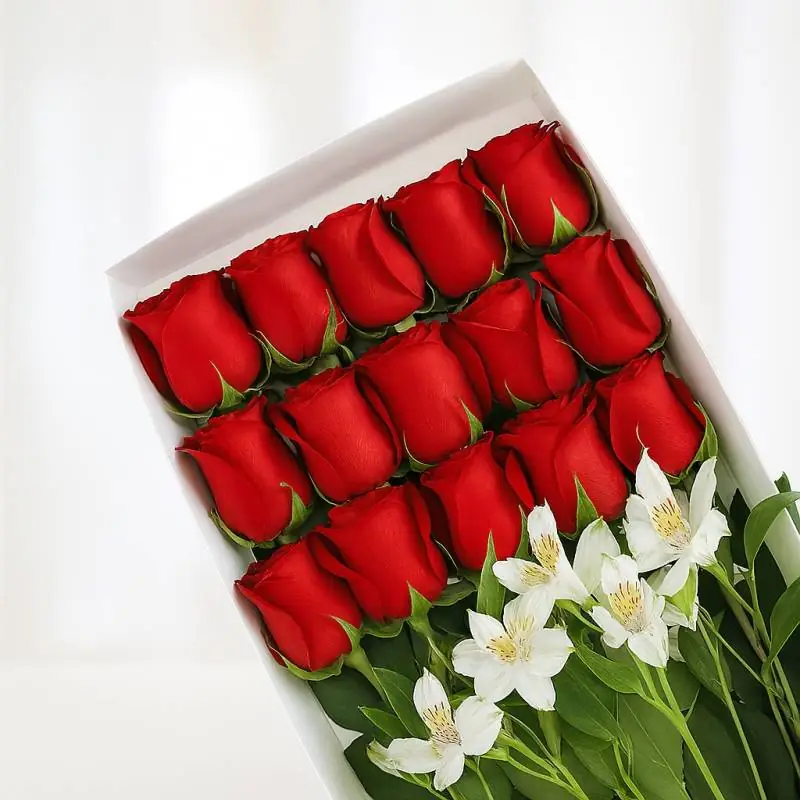 Una delicada caja esconde los más intensos sentimientos del alma, sentirá como la pasión se apodera de su vida, sorprende a ese ser con este hermoso detalle. Adentro de la caja se ubican 18 rosas rojas y follajes verdes, la caja va con su respectiva tapa. Te recomendamos acompañar este diseño con globos, chocolates, peluches o vinos para hacer aún más especial tu detalle, en el siguiente paso de la compra puedes agregar a tu orden estos productos si lo deseas.