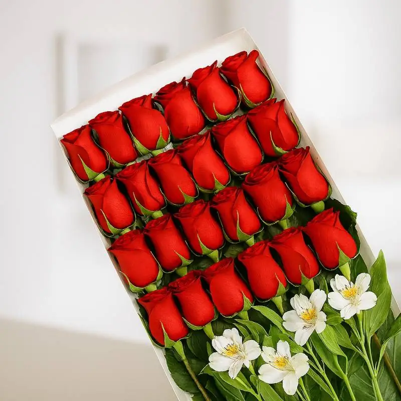 Una delicada caja esconde los más intensos sentimientos del alma, sentirá como la pasión se apodera de su vida, sorprende a ese ser con este hermoso detalle. Adentro de la caja se ubican 24 rosas rojas y follajes verdes, la caja va con su respectiva tapa. Te recomendamos acompañar este diseño con globos, chocolates, peluches o vinos para hacer aún más especial tu detalle, en el siguiente paso de la compra puedes agregar a tu orden estos productos si lo deseas.