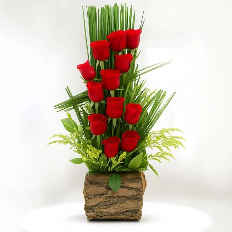 Las rosas son especiales para regalar en cualquier ocasión, su perfume y su aroma puede enamorar a cualquiera, obsequia este lindo arreglo floral compuesto de 12 rosas sobre base rustica de madera y follajes verdes. Te recomendamos acompañar este diseño con globos, chocolates, peluches o vinos para hacer aún más especial tu detalle, en el siguiente paso de la compra puedes agregar a tu orden estos productos si lo deseas.