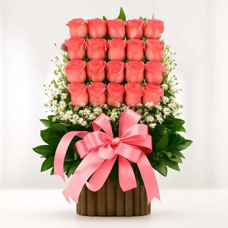 Dile todo lo que sientes a esa persona especial, y sorpréndela con este hermoso diseño de 25 rosas fucsias o rosadas y follajes verdes sobre base de bambú o similar, el cual atrapará su corazón para siempre. Te recomendamos acompañar este diseño con globos, chocolates, peluches o vinos para hacer aún más especial tu detalle, en el siguiente paso de la compra puedes agregar a tu orden estos productos si lo deseas.