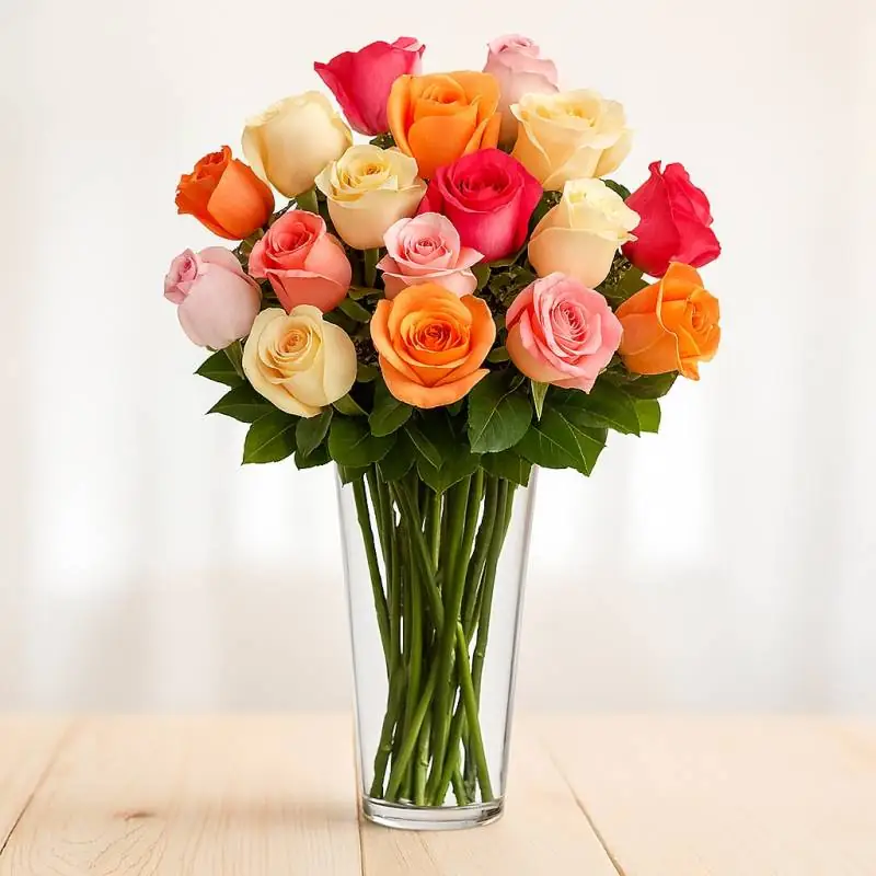 Jarrón con 18 Rosas Multicolor - Rosas - Deja que tu corazón saque a relucir esos sentimientos tan hermosos, para esa persona que tanto amas, con esta preciosa combinación de 18 rosas en tonos surtidos y follajes verdes ubicados sobre un jarron de vidrio transparente. Te recomendamos acompañar este diseño con globos, chocolates, peluches o vinos para hacer aún más especial tu detalle, en el siguiente paso de la compra puedes agregar a tu orden estos productos si lo deseas. - Dalerosas